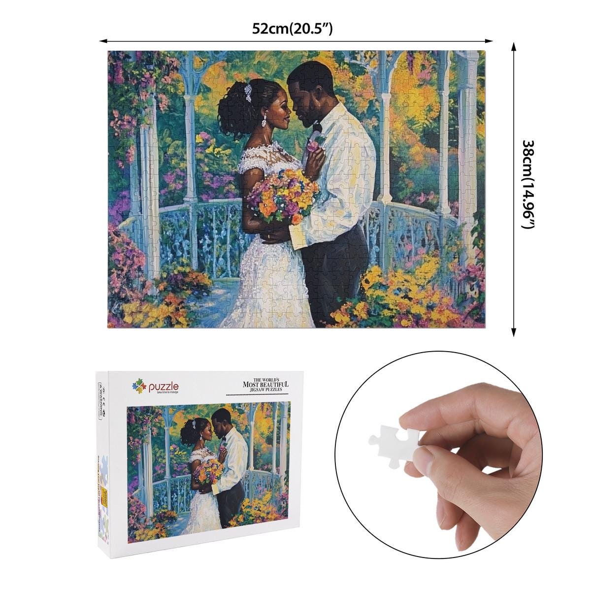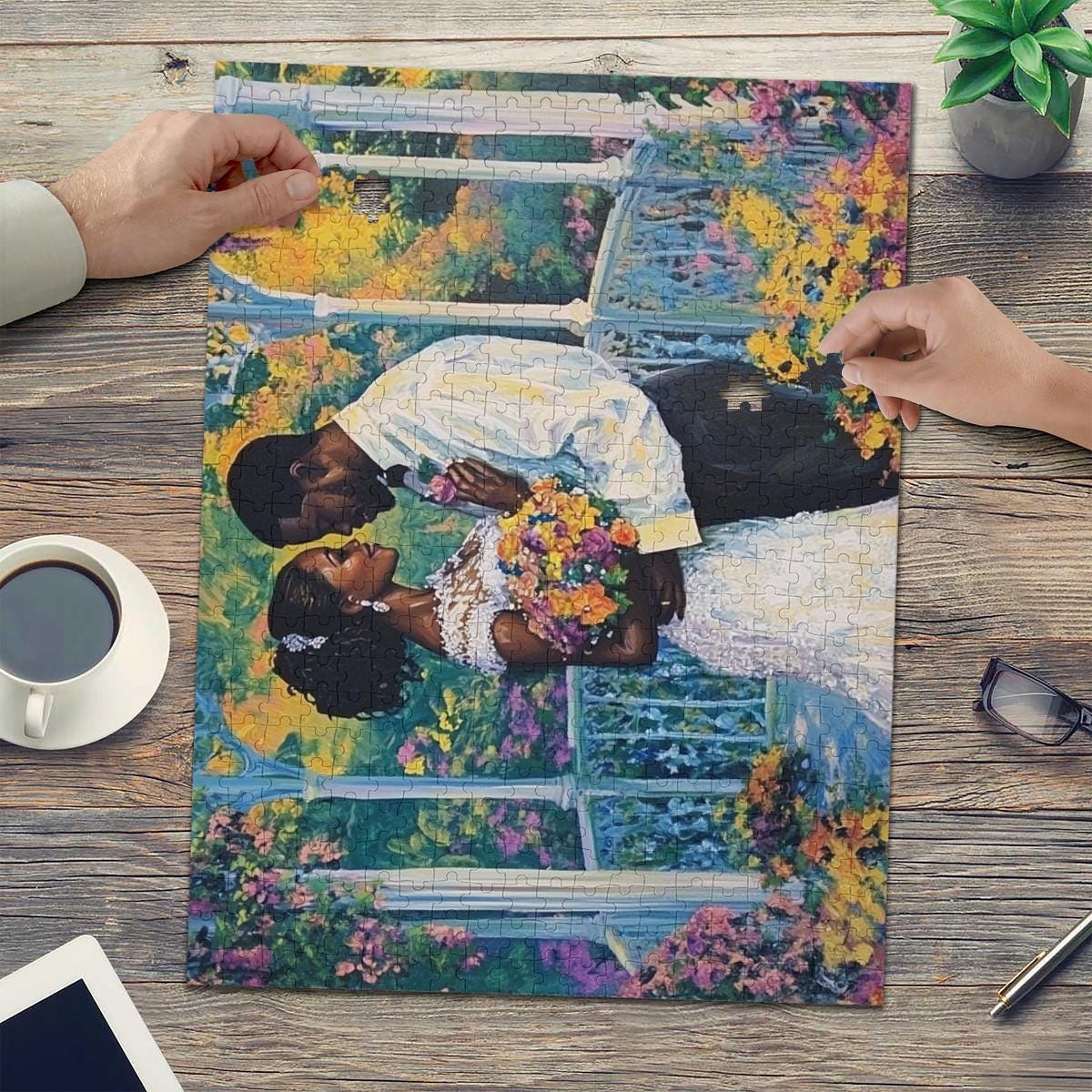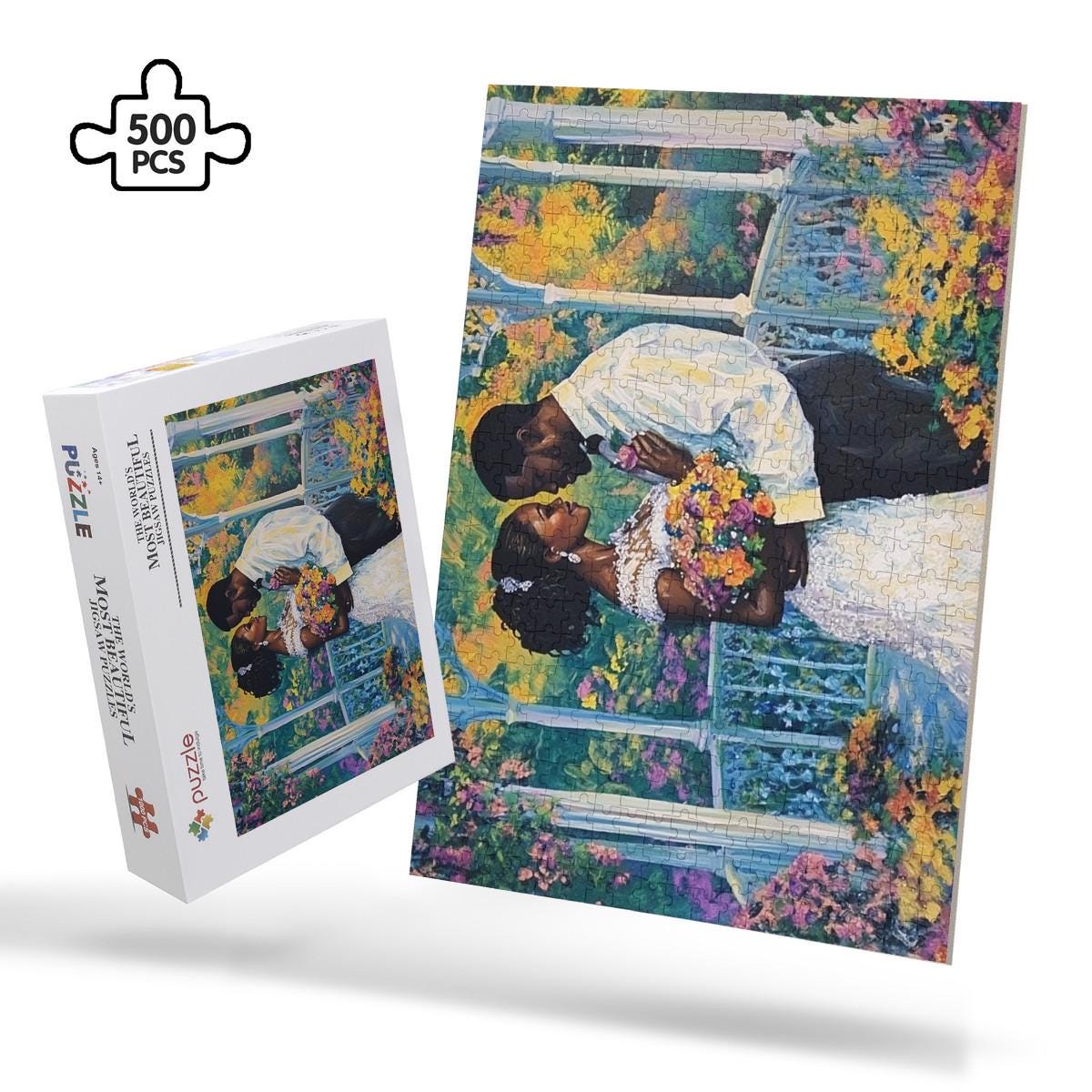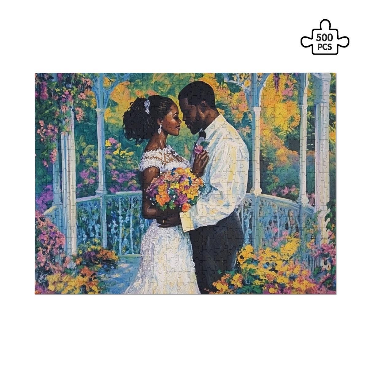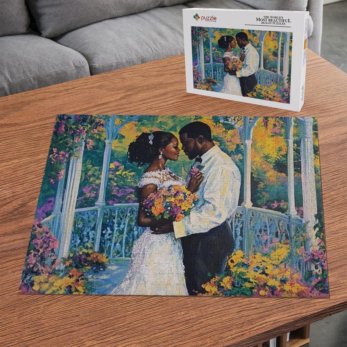 Celebrate the beauty of Black love with “Forever Begins Here,” a 500-piece jigsaw puzzle capturing the intimate moment of a newlywed couple under a flower-filled gazebo. Drenched in vibrant colors and wrapped in the warmth of romance, this puzzle features a stunning Black bride and groom locked in a tender gaze—her bouquet bursting with joy, his hands gently holding hers.