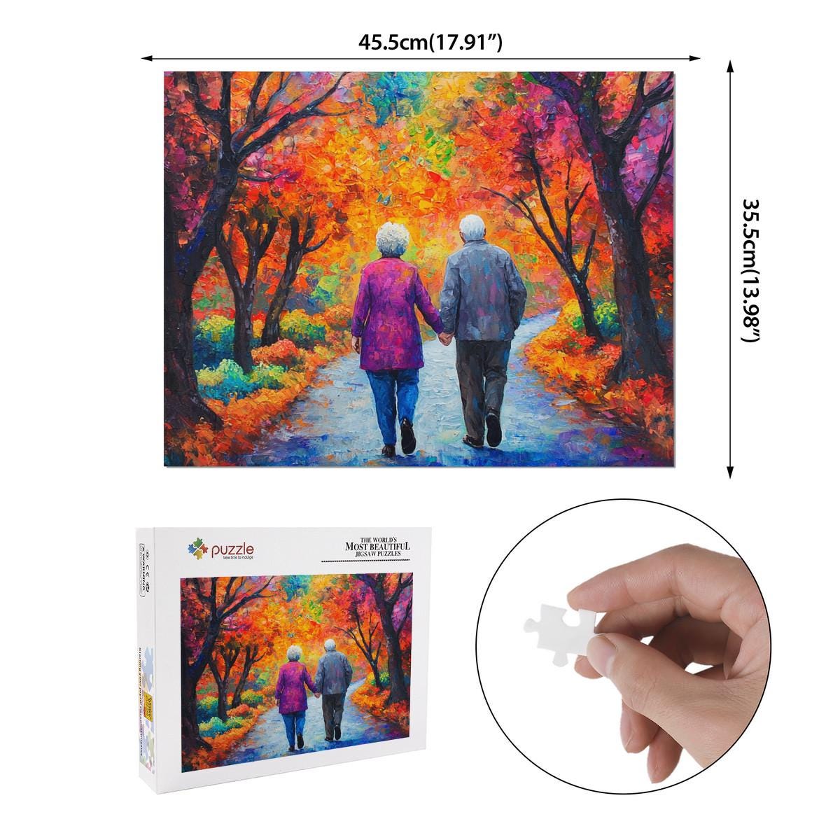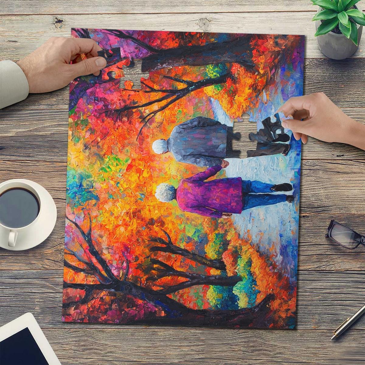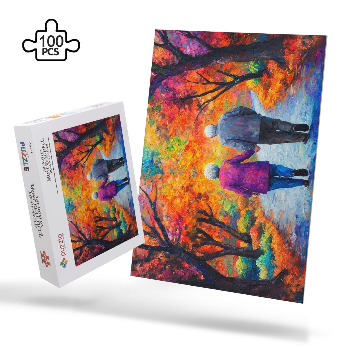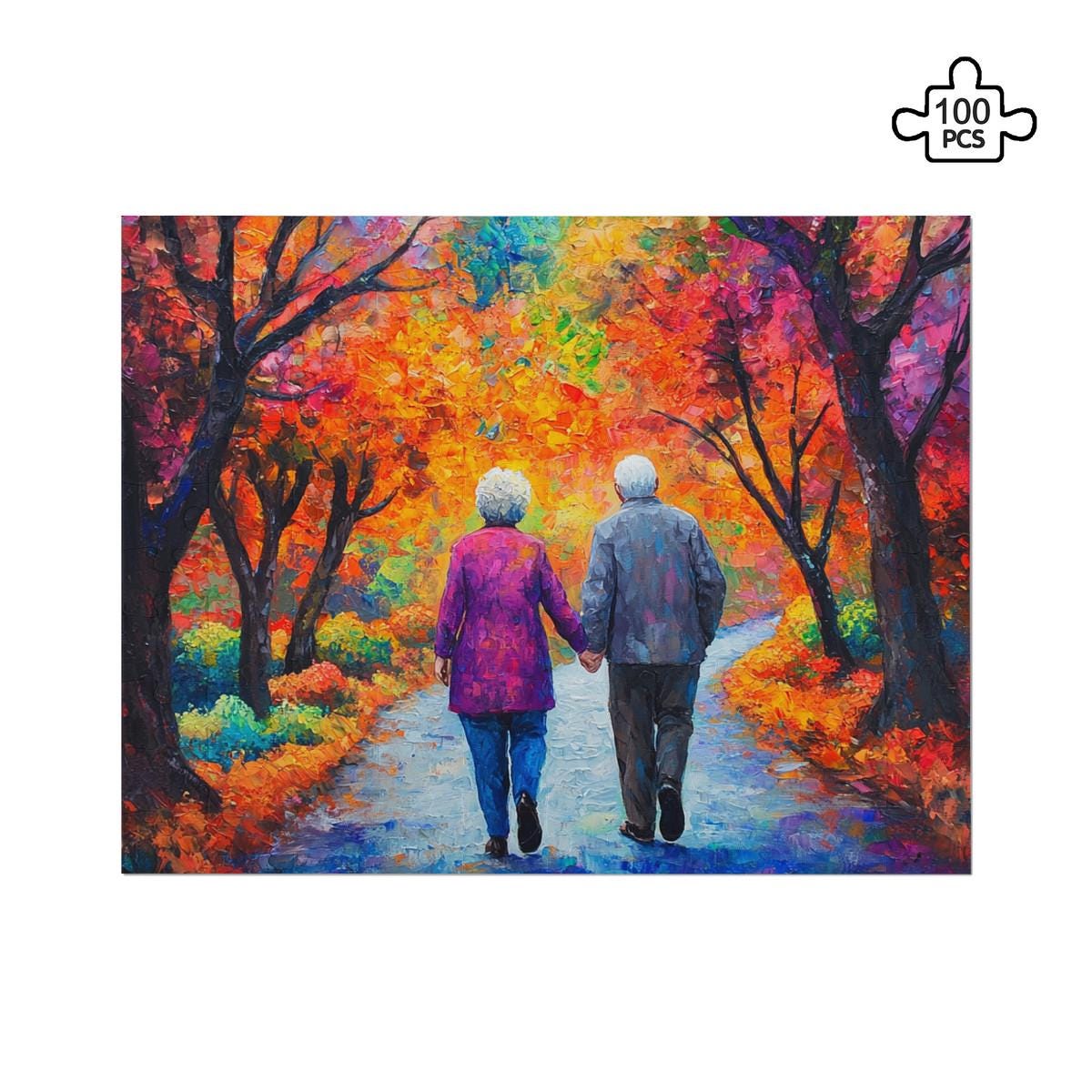 Take a peaceful stroll through time with “Seasons of Love”, a heartfelt 100-piece puzzle celebrating enduring connection and timeless companionship. Featuring a beautifully illustrated older couple walking hand in hand down a vibrant, tree-lined path ablaze with fall colors, this puzzle honors lifelong love, resilience, and shared journeys.