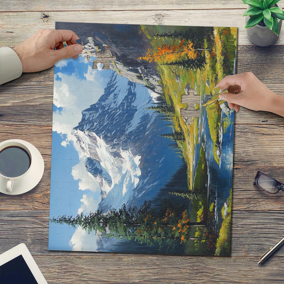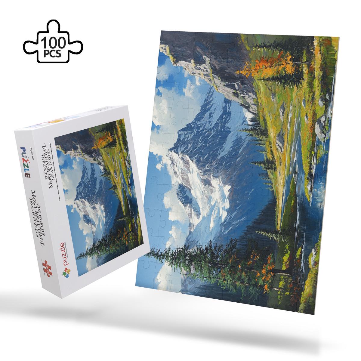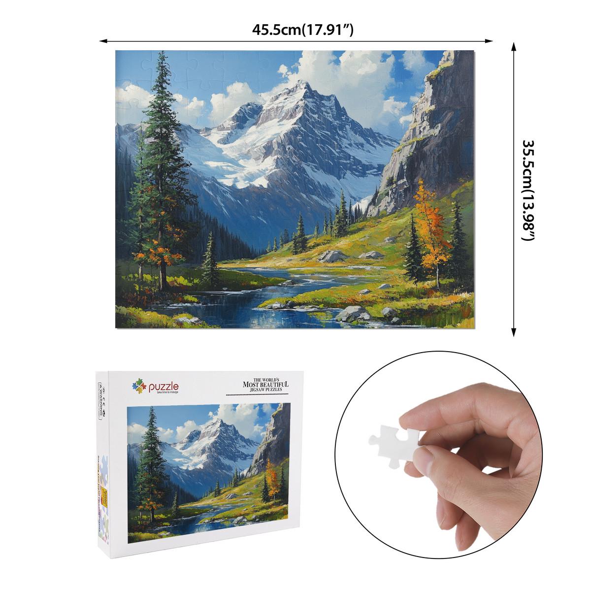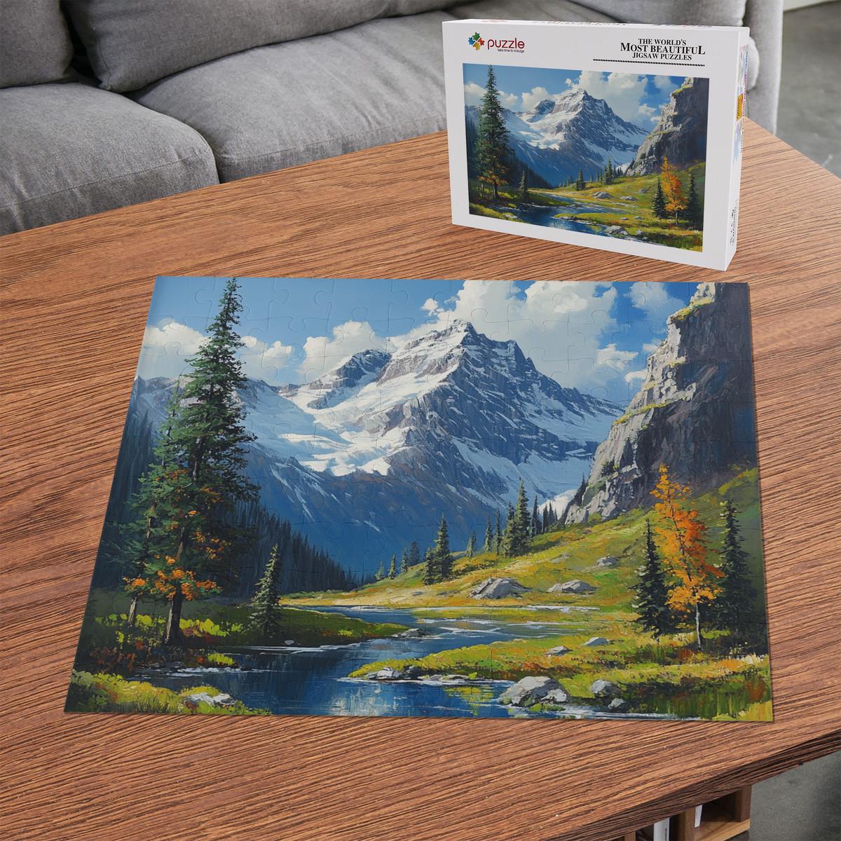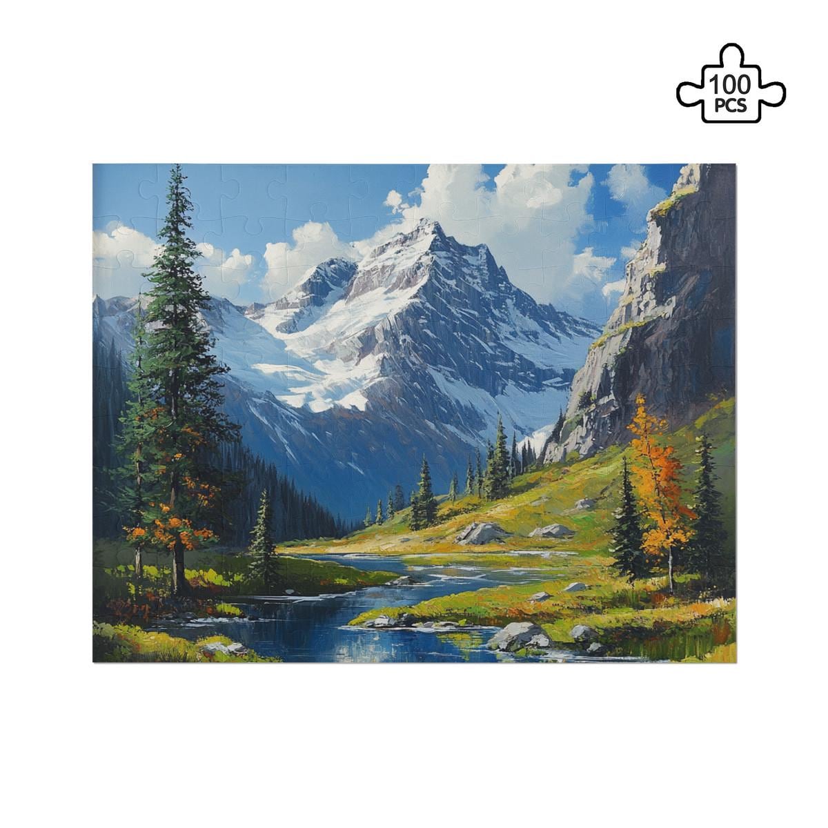 Product Description: Escape into the breathtaking beauty of nature with Majestic Mountain Serenity, a 100-piece jigsaw puzzle from PuzzleVybe. This vibrant design captures a stunning alpine scene — snow-capped peaks towering over a peaceful valley, where a crystal-clear stream winds through lush meadows dotted with evergreens and golden autumn hues.