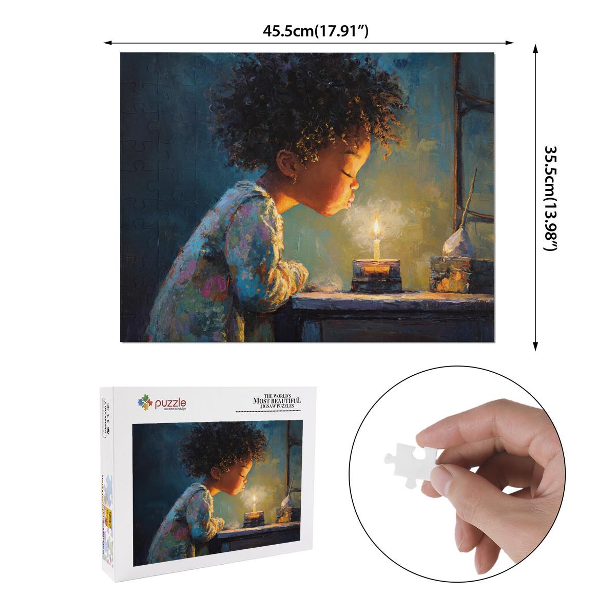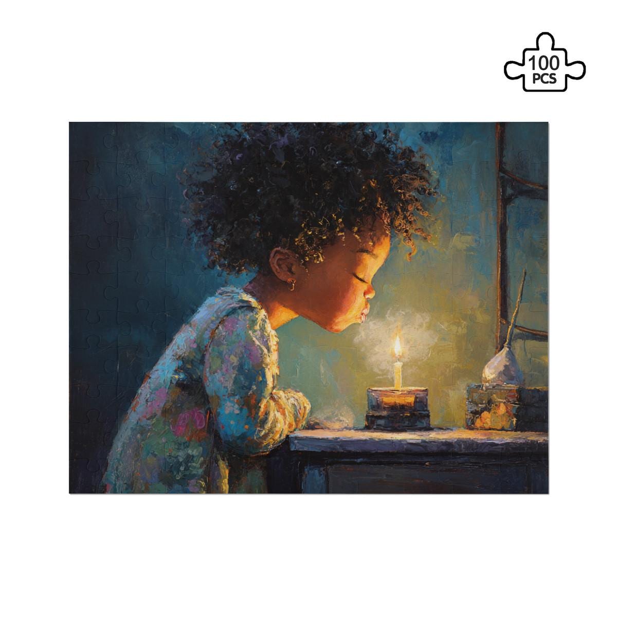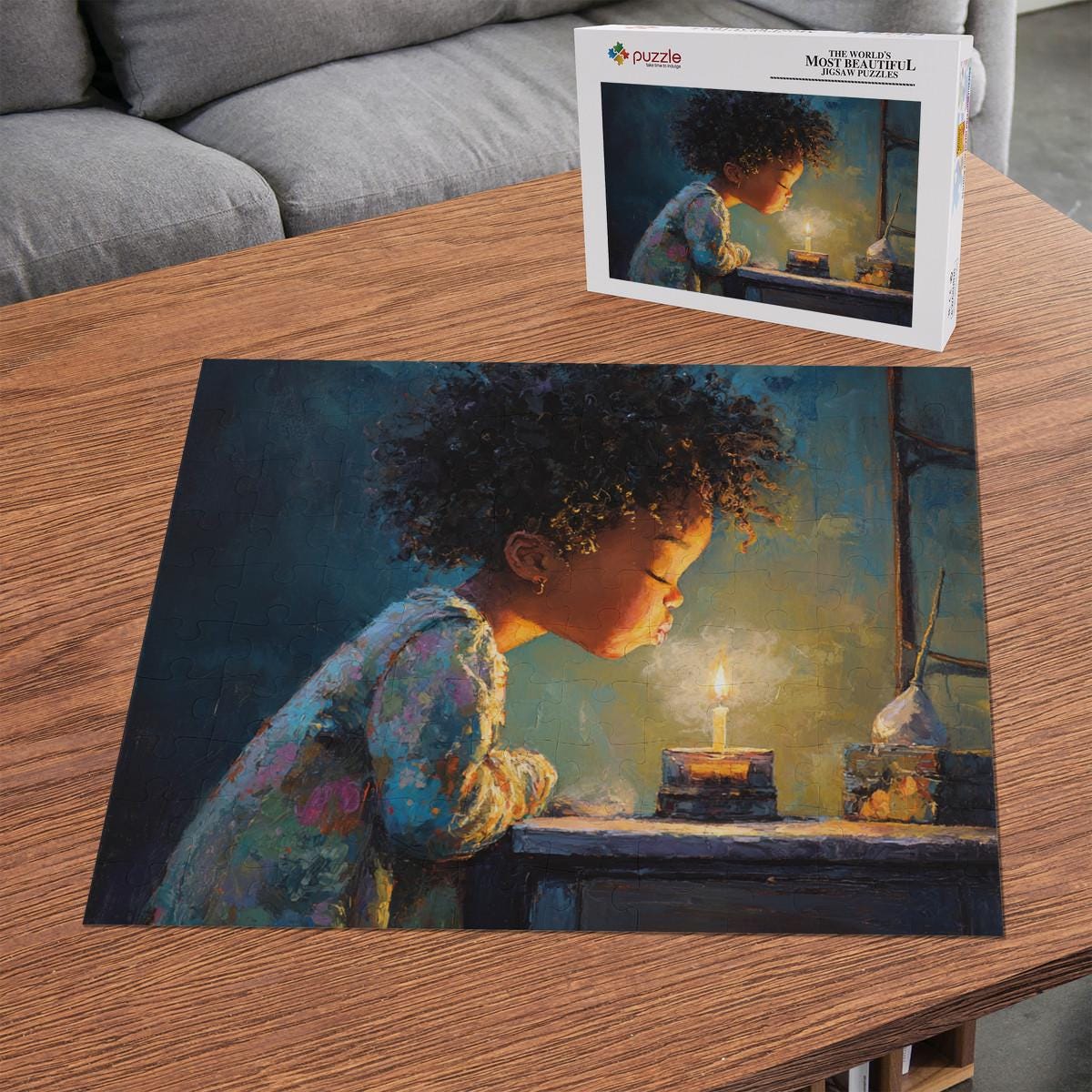 Goodnight Glow is a warm, peaceful 100-piece jigsaw puzzle featuring soulful Black art that celebrates the quiet beauty of bedtime. This calming scene shows a little girl gently blowing out her candle for the night, with soft golden light illuminating her curls, pajamas, and nightstand.