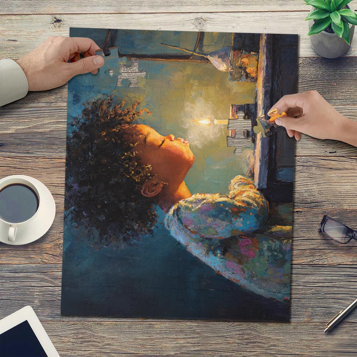 Painted in rich, expressive brushstrokes, this puzzle brings comfort, nostalgia, and cozy evening energy to your home. Perfect for kids, teens, and adults who love Afrocentric art, peaceful imagery, and puzzles that feel both relaxing and meaningful.